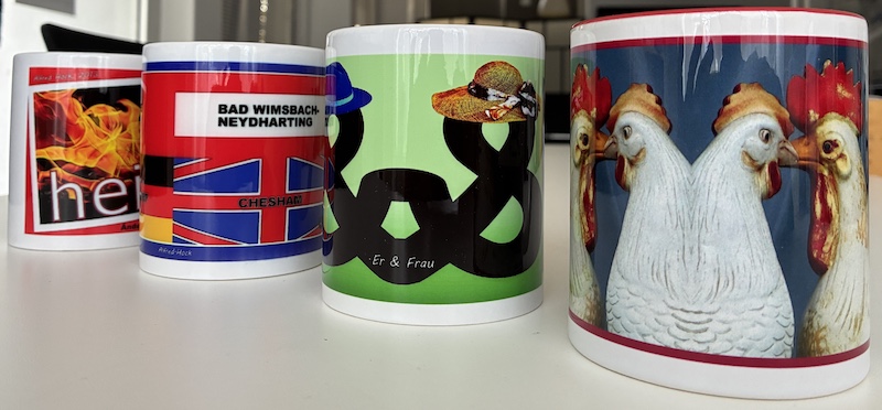Die Spende umfasst darüber hinaus einige Tassen, die ebenfalls originell und sorgfältig bemalt sind. Auch die Tassen sind derzeit im Schaufenster in der Ringstraße zu bewundern.